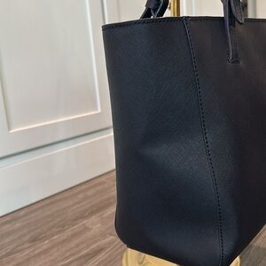 Tory Burch York Buckle Tote Tory Burch saffiano leather tote in Navy with gold hardware Thin, buckled shoulder straps; 9" drop Double-T logo medallion at front Open top provides easy access to belongings Center zip compartment divides interior. Inside: one zip and four open pockets. 9"H x 12"W x 4"D Excellent Used Condition - please review all pictures! No stains, rips, tears, or odor. From a smoke free home.