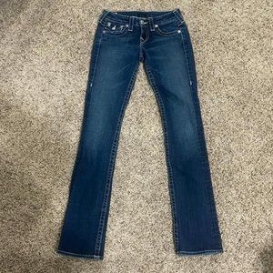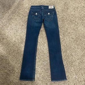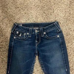 EUC: True Religion Boot Cut Mid-Rise Denim in Blue. The Mid-Rise waistline and boot cut finish make these straight leg jeans perfect for any colder weather activity. Comfortable fit for with no pinching or unneeded tightness makes them great for everyday wear. Only worn twice before purchasing a smaller size. Perfect condition with no marks, stains or pulls.