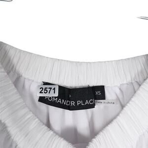Keywords: Pomander Place, Tuckernuck, mini dress, white dress, spring fashion, square neckline, 3/4 sleeves, elastic waist, cotton blend, machine washable, women's fashion, casual wear, daytime dress, XS size, pre-owned.