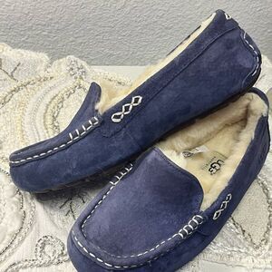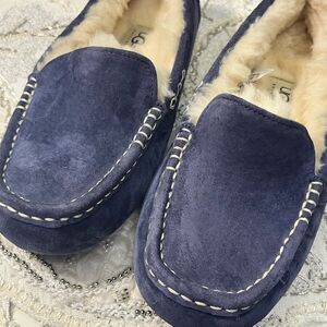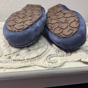 Experience comfort and style with these blue suede moccasin slippers. Perfect for lounging, these slippers feature a soft interior for ultimate relaxation.