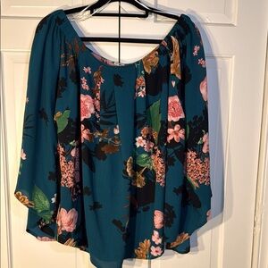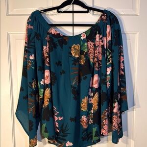 EUC Umgee Relaxed Teal Floral Blouse with 3/4 Flutter Sleeves On or Off Shoulder
