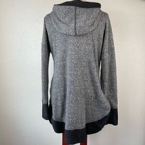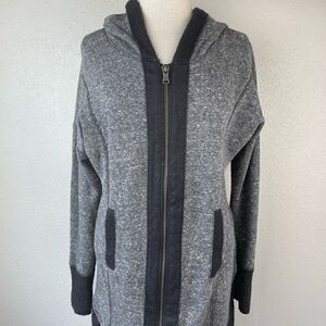 EUC VENUS Womens Black and Gray Athletic Zip Up Long Sweatshirt Size M. This is a super comfy and cute top, featuring slits on the side. It measures 24 inches armpit to armpit and 33 inches in length. Super cute with leggings.