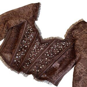 EUC! VS Dream Angels Brown Rhinestone Long Sleeve Corset Bra Top Size XS
