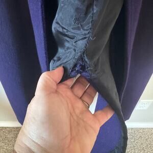Condition Notes: The black inner lining has been stretched and hangs slightly below the coat hem in some spots (see photos). There is also damage/separation in the lining at the top of the back vent/slit (see photos).