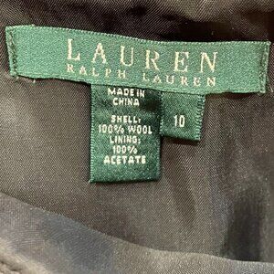 Vintage Lauren Ralph Lauren tailored midi skirt featuring a high-rise, side zipper closure, fluted hem, slip lining, and a mid to heavyweight felted 100% wool fabric in a neutral charcoal grey herringbone.