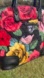 Elegant quilted tote with vibrant floral pattern. Features bold roses in red, yellow, and pink on a black background. Perfect for adding a pop of color.
