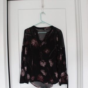 Black sheer top with pink and mauve color scheme flowers. Plain black cami underneath.