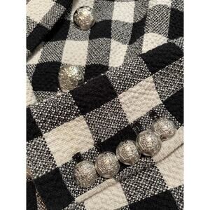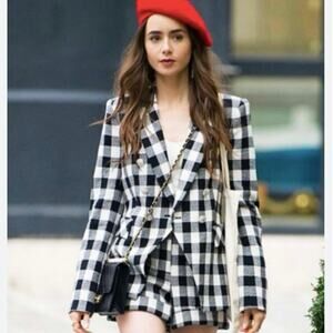 Gorge jacket famously worn by Lily Collins in Season 1 of "Emily in Paris," is a stylish and versatile piece. This features a classic black and white checkered pattern, a double-breasted front with elegant silver buttons, and a tailored fit that accentuates the waist. It includes two functional front pockets and is designed with the brand's signature dickey insert, allowing for versatile styling options. A must have for both professional and casual settings, this jacket embodies effortless perfection! Worn only three times.
