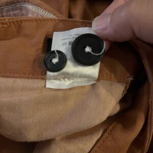 Veronica Beard Ryder Pleat Front Pants Wide Leg Side Tuxedo Stripe in color Clay. Button closure at waist. Side pockets. Back welt pockets w/button details. 98% Cotton, 2% Elastane.