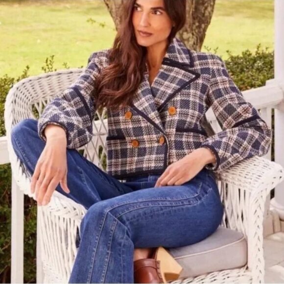 EUC Veronica Beard Aise Double Breasted Plaid Tweed Jacket Ink Multi Size 12