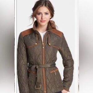 KEYWORDS: Vince Camuto Quilted Jacket... Elbow Patch Weekend Jacket...Military Style Shoulder Jacket...Olive Greeb Quilted Jacket...Casual Jacket...Hunting Style Jacket...Water Proof Jacket...Equestrian