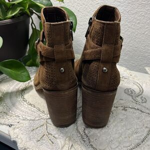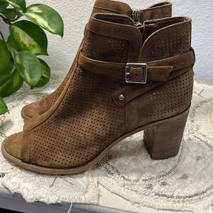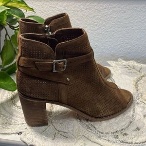 Step out in style with these chic brown suede peep-toe ankle boots. Perfect for any occasion, they offer both comfort and elegance. Barely worn, just light signs of wear. Please see pictures and ask any questions.