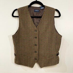 Vintage Liz Claiborne vest and skirt set made of 100% wool in an autumnal olive green and chocolate brown houndstooth pattern. Vest features a v-neck, button-front closure, side faux suede buckles, mini welt pockets and a fully-lined interior. Skirt features a wrap design with button closure, fringe trim, a-line silhouette and fully-lined interior. One of my all-time favorite finds