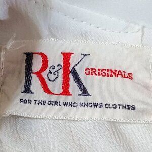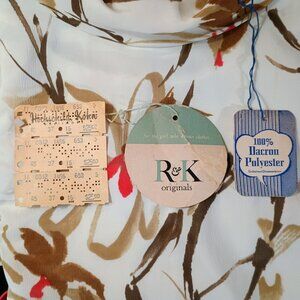 Excellent Used Condition: This beautiful vintage R&K Originals dress from the 1960s is a lovely example of classic mid-century daywear. Made from 100% Dacron® polyester, it features a crisp white background decorated with a stylized floral print in warm tones of beige, brown, and rust red. The sleeveless A-line silhouette, high rounded neckline, and fold-over collar give it a timeless, polished look, while the original thin braided rope belt adds gentle definition at the waist. This dress was originally purchased at Hochschild, Kohn & Co. in Baltimore, a charming piece of department-store history preserved with care. A wonderful collectible garment for vintage lovers, costume designers, or anyone who appreciates authentic 1960s style. Size: vintage sizing may vary, please refer to the photos and measurements for the most accurate fit, approx. 19" bust flat (about 38" circumference).