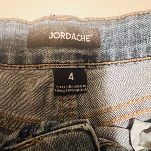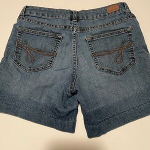 These Jordache jean shorts feature a classic straight cut in a medium-to-dark blue wash, offering a versatile and casual look. The denim material is designed for comfort and style, making them perfect for everyday wear.