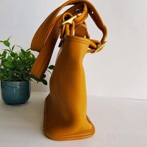 This excellent used condition Coach Legacy Small Shopper (#9086) is in the hard-to-find color Yellow. Made in the United States in 1998. It has been embellished by me with leather flowers from Italy. The flowers have been permanently riveted to the front of the bag. Can be worn as a shoulder carry or hand carried.
