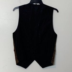 Adorable vest is a classic brown, gold, tan and black tapestry, has a silky back, and buttons up the front. Fake front pockets add an extra detail. Excellent used condition showing normal signs of wear. Perfect addition to any wardrobe!