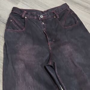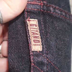 EUC Vintage Gitano Black/Burgundy High Waisted Tappered Straight Jeans, button fly and many different fun details. Super RARE but fun statement jeans. Waist flat is 13", 12" rise and 29" inseam.