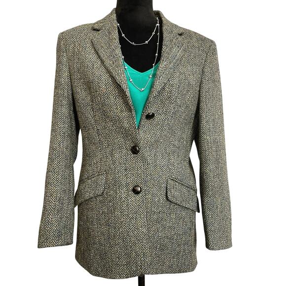 EUC - Vintage Harris Tweed Black, Blue, Green Scottish Herringbone Wool Blazer