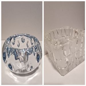 Heavy glass Vintage votive candle holders by PartyLite. One is round with a pattern that is called Linnea. Approximate measurement is 3.25" wide by 2.75" tall. The other is square with cut pattern clear and frosted and is called Manhattan. Approximate measurement is 2.75" wide by 2.75" tall. Both come in their original box. Each can be used with a votive or a tea light candle. Excellent used Vintage condition.