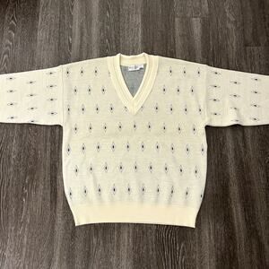 EUC Vintage St. Croix Knits Wool V Neck Sweater Cream Blue Diamond USA Made Sz L