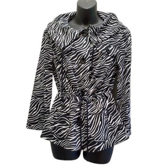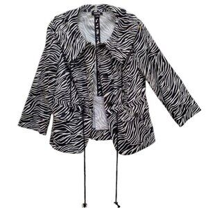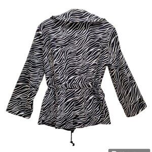Excellent Used Condition Vintage Zebra Print Elementz Light Cotton Jacket, Featuring Adjustable Drawstring Cinched Waist and Collar, Three Quarter Sleeves (that can be cuffed), 4 Flap Pockets, and Cute Pleating on Backside.