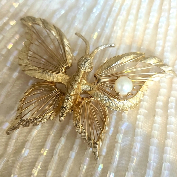 This is a gorgeous vintage butterfly brooch by Brooks. The gold toned metal frame has a textured finish. Gold toned wire is wrapped around the wings forming the inside of the brooch. There is a single 4.4mm white pearl set into a pronged setting on the upper right wing. The pin back is secure. Signed on back.