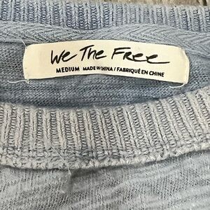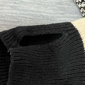 This top has it all! The sleeves are a sweater knit, the body is a mix between a blue and gray knit fabric. The sleeves have thumb holes for added warmth.