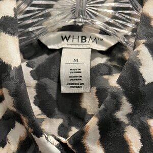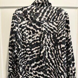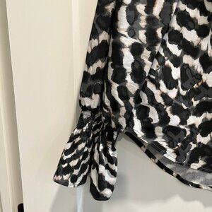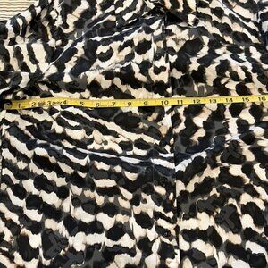 Dressy long sleeved ruffle cuff WHBM in exotic print. Dominant colors are black and white with tan accents in print. Button front with slightly longer tail in back. In excellent used condition. No flaws. Comfortable and easy care.