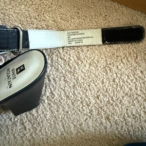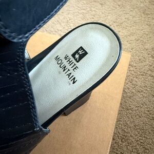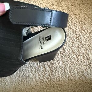 Only worn a few times and these black heeled sandals by White Mountain have minimal wear as shown. I can no longer wear heels. :-/ Great sleek design with open toe. Ideal for stylish outings. Velcro strap.
