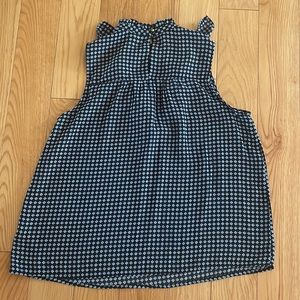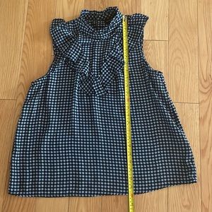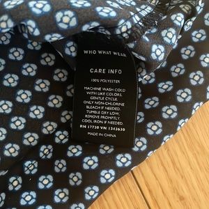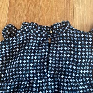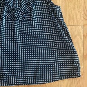Excellent used condition Who What Wear brand she’ll tank top with a flattering front ruffle. Black tank with light blue and white pattern. Gold button closure at the neck. High neckline. Loose and flowy fit. Size medium. Cute tucked into white jeans or a skirt or to wear under a blazer at work!