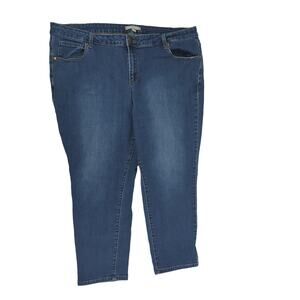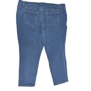 This frontal zipper and button closure, cotton blend, blue jeans from Woman Within is great for any occasion. They are in EUC with no holes, rips nor stains. Measurements waist=21.5/43 front rise=11.5 hip=23 thigh=12 length=36 knee=8.5 inseam=25 hem=7.5 70% Cotton 26% Polyester 3% Rayon 1% Spandex