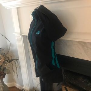 Excellent pre-owned condition, Adidas lightweight woman’s athletic jacket. Black and aqua green, front zipping, complete with pockets, and neck tightening toggle. Size small.