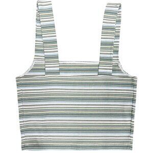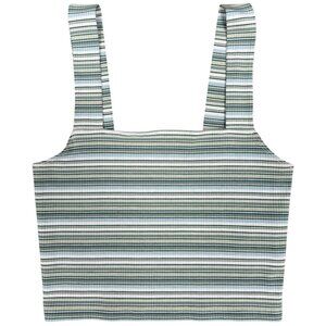 * STYLE- Striped, cropped knit tank top. Square neckline. Sleeveless. Wide supportive straps. Soft. Stretchy.