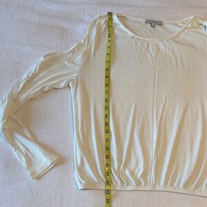 Elegant and modern, this off-white Allison Joy Loni top is a versatile piece that works for both casual days and dressier nights. Designed with chic open shoulders, long sleeves, and a flattering banded bottom, it’s both stylish and comfortable. Worn only once – truly excellent used condition.