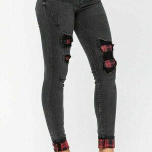 * STYLE- The "Rayann" from Judy Blue. Classic stitching, distressed around the hem, zipper fly and button waistband jeans. Comfort-level stretch. Figure-flattering, slimming design. Perfect capsule wardrobe/closet staple jeans. Destroyed. Patched with red and black buffalo plaid. Skinny Cut. Cuffed with buffalo plaid - can be uncuffed. Washed Black. Mid-Rise. 5-Pocket Styling.