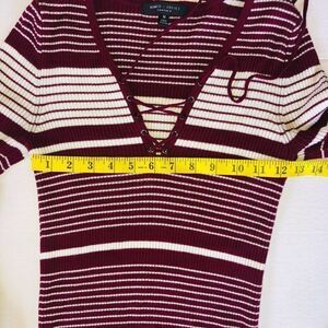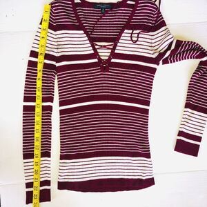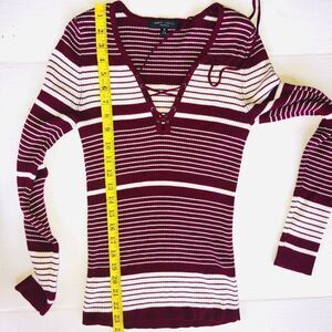 Excellent Used Condition (No Visible Signs Of Wear) Womens Medium Romeo + Juliet Couture Long Sleeve Lace Up Knitted Sweater. Soft Material. 80% Rayon/18% Nylon/2% Spandex. Maroon & White Color. Smoke Free Home. #Romeojulietcouture