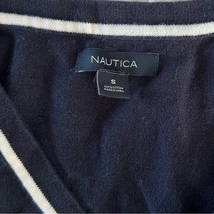 EUC Women's NAUTICA Navy and White Striped V Neck Cotton Sweater Size Small
