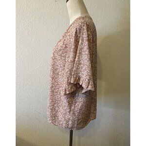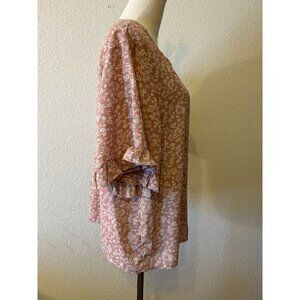 Just in time for spring! This Shein brand dusty rose & white floral patterned pullover shirt size large is lightweight and airy. Oversized sleeves with ruffles to add a dressy touch.