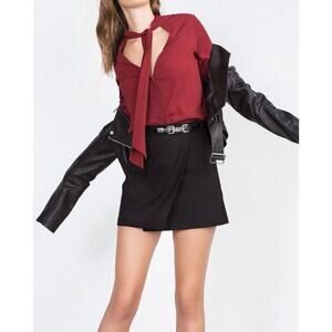 Structured and modern Zara mini skirt in classic black. Features an asymmetric wrap-style front with pleating detail and decorative buckle waistband accents. Clean lines with a tailored fit make this an easy piece for both casual and dressed-up styling.