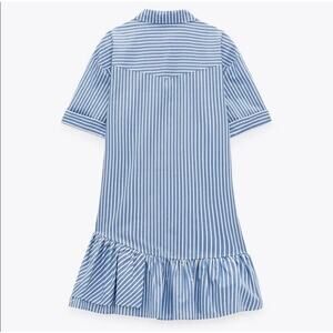 Effortlessly chic Zara mini shirtdress in classic blue and white stripe. Designed with a collared neckline, partial button placket, and short cuffed sleeves. Features dual chest pockets, a relaxed fit through the body, and a feminine asymmetrical ruffle hem. Crafted from crisp 100% cotton poplin for a clean, structured drape.