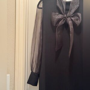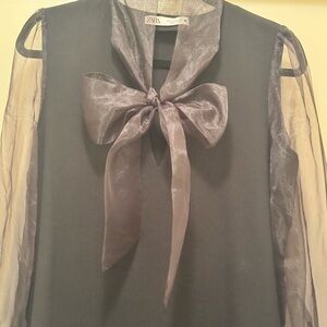 EUC Women’s Zara black mini dress. It has sheer sleeves, the sheer material on the front of a v-neck that ties in a bow. It is a size medium. It is a Beautiful dress.