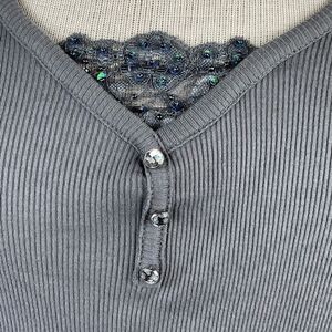 EUC Adorable Zena Jeans Womens Gray 3/4 Sleeve Top with Lace/Sequins V-Neck with Rhinestone Buttons Size M. It measures 18 inches armpit to armpit and 27 inches in length.