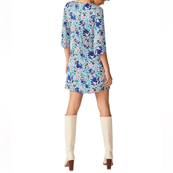 Orika abstract-print mini dress from BA&SH featuring blue, multicolour, abstract pattern print, plunging V-neck, rear zip fastening, half-length sleeves, gathering at the hip and above-knee length.
