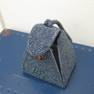 EUC blue evening wristlet purse bag clutch. The color is kind of a grayish blue. Beautiful beading pattern throughout, with a single snap at the top for easy entry. Roomy compartment inside to store all of your evening essentials. Short beaded strap at the top. This purse is in excellent used condition - it was used once for a formal event. There is a small area around the top entry rim of the purse where a few beads are a little loose (see second to last photo). Tags: prom gala wedding party
