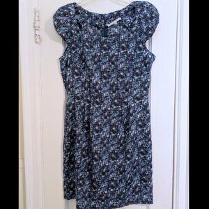 lightweight and suitable for summer, minidress with blue and white pattern by Collective Concepts. scoop neck, zips in the back, elasticated cap sleeves.