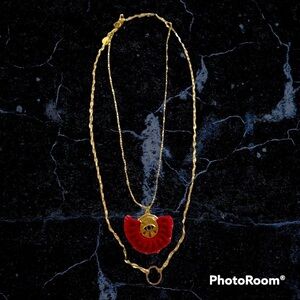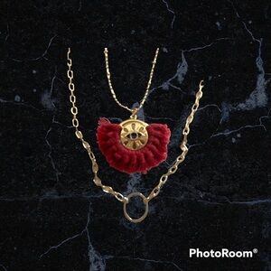This is gold toned and has a double chain. The tassel is maroon in color! 18 inches long.