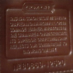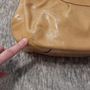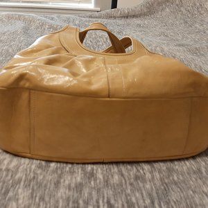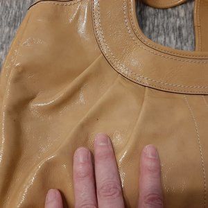 EUC large tan patent leather bag by Coach with lovely cream plaid lining. Center compartment with turnlock closure. Two large side pockets (one with zippered pocket; the other with two open pockets.