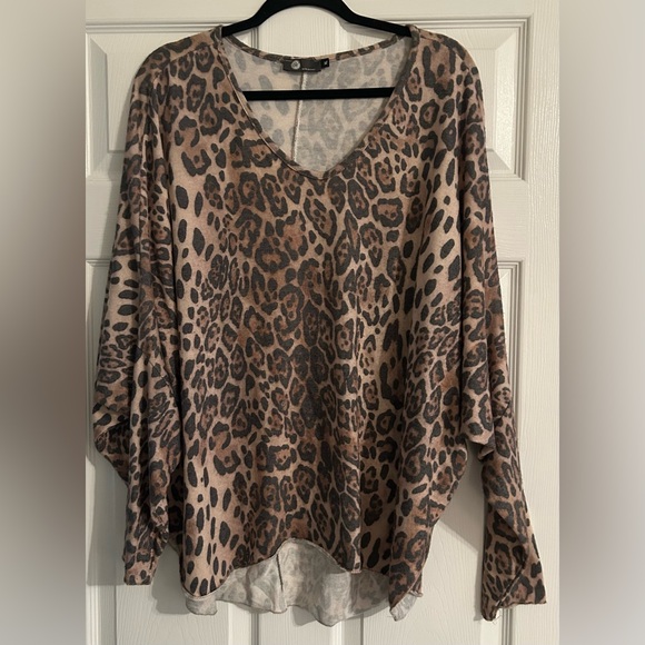 EUC leopard top. Very soft fabric. High/low design. Dolman sleeve with narrower bottom (with stretch). Flattering v-neck.