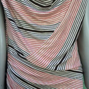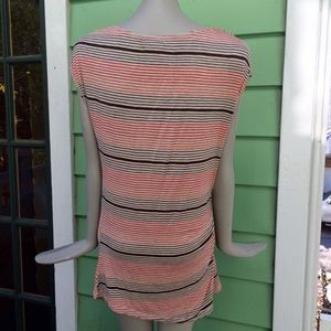 Multi colored t shirt that gathers on the side to give a slimming effect. It is a linger t shirt, but not quite a tunic! EUC, worn maybe three times. Smoke free home. For a large, I found this to be a little too tight for me in the belly. I was a size 12.